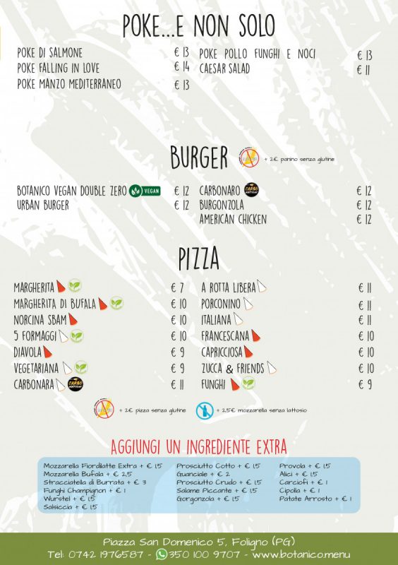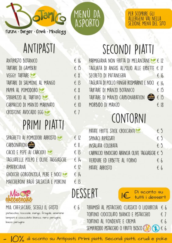 Botanico è Ristorante, Pizzeria, Hamburgeria e Pokeria tutto insieme! Ti offriamo il menù da asporto più vario sul mercato: dalla Pizza agli Hamburger, Fritti e Poke, Tartare e Pasta, Carne Antipasti e Dessert… ordina e passa a ritirare!
